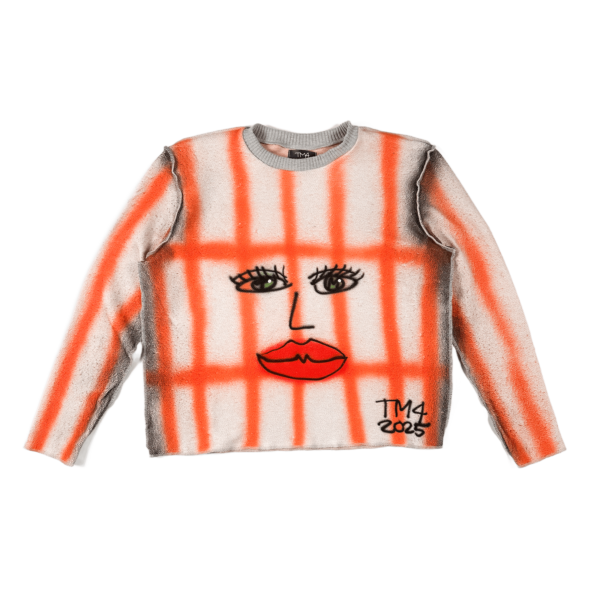 This sweater is made from soft cotton French terry and hand airbrushed with an airbrushed face on orange grid on the front.