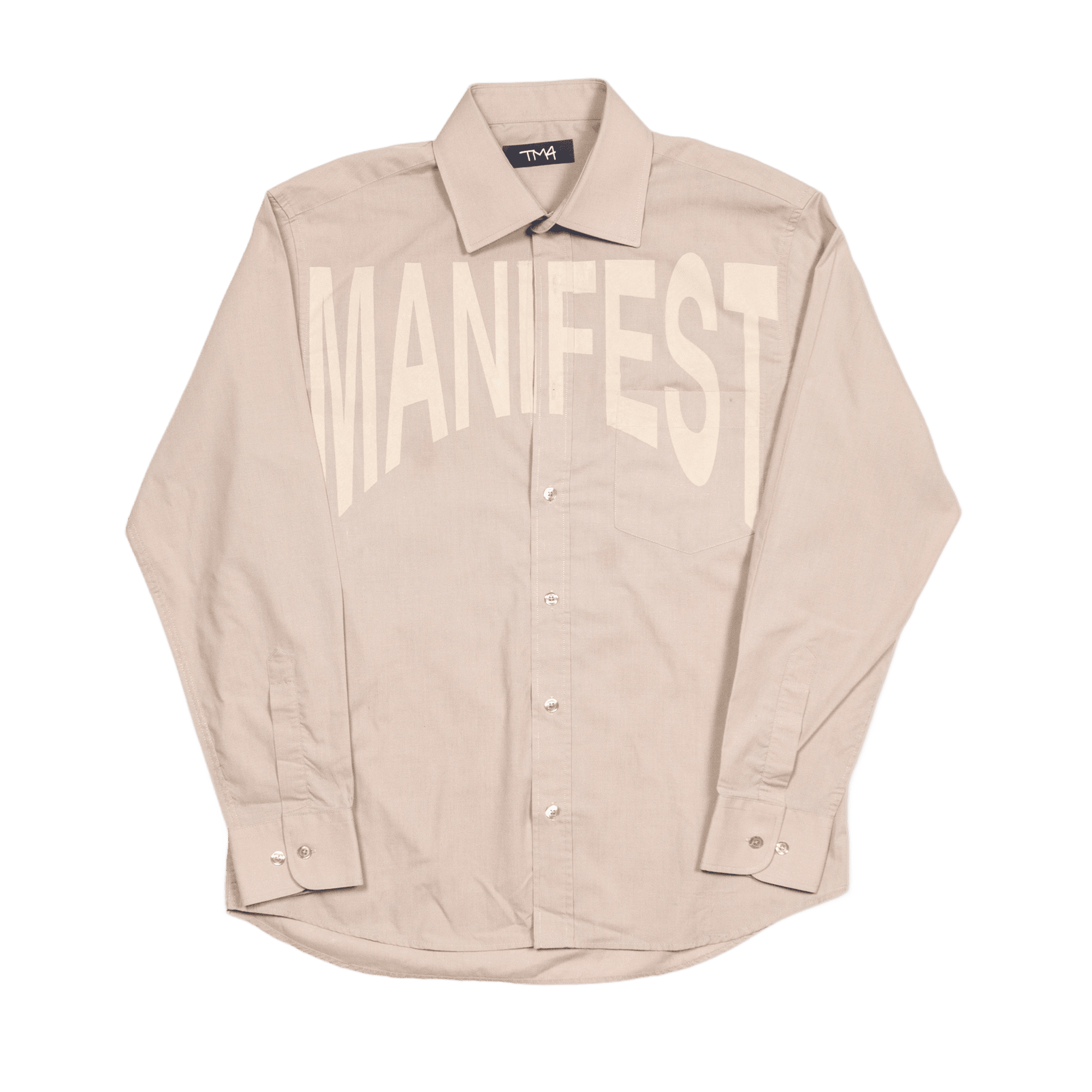Button-up shirt featuring a “Manifest” screenprint on the front. A classic silhouette with a statement graphic, designed for everyday wear and easy styling.